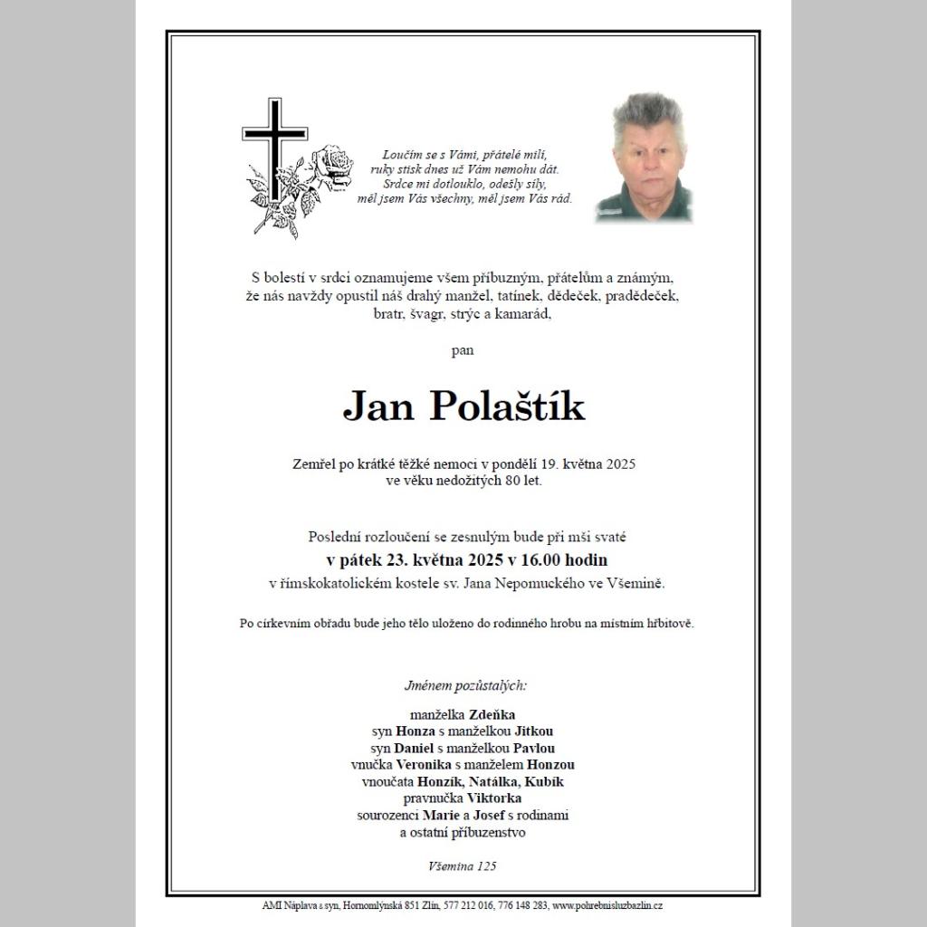 Ve věku nedožitých 80 let nás opustil pan Jan Polaštík. Čest jeho památce! (vk)