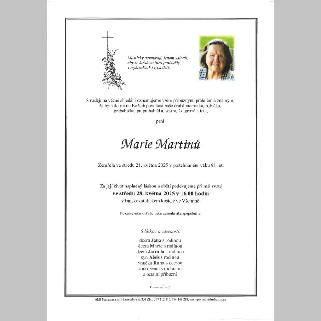 V požehnaném věku 91 let nás opustila paní Marie Martinů. Čest její památce! (vk)